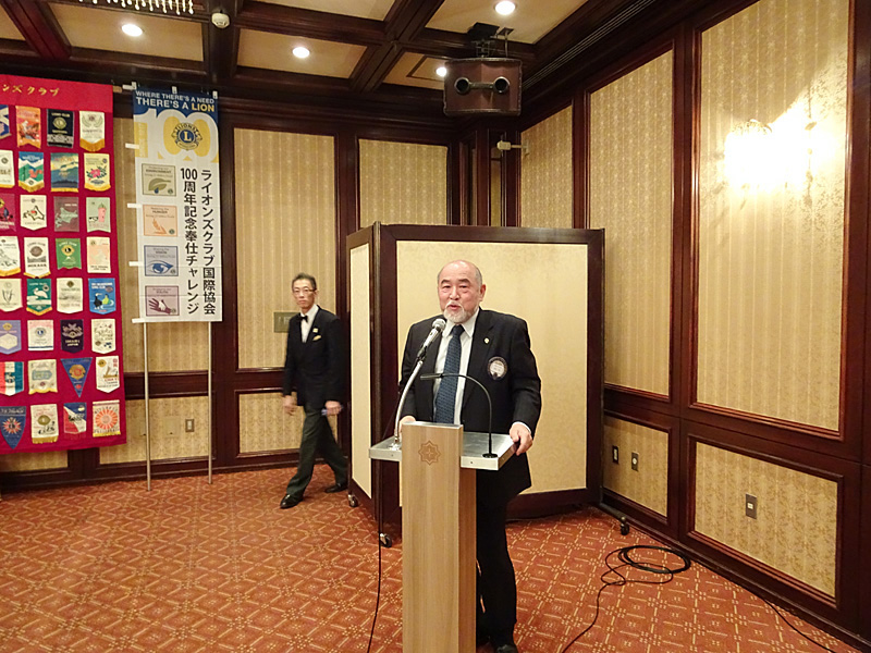 定刻18時よりライオンテーマのL磯野亮太司会で第1369回例会第1部が始まりました。会長の開会宣言・コング、ライオンズの誓いには、L三塚順昭の発声で今回初めて品格の高いグランドホテルでのライオンズの誓いだったそうです。次に昭和34年11月結成以来、50名の物故会員の慎み、L伊藤和廣前会長の進行にて全員での黙禱。